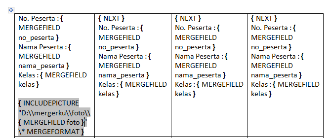 Keduabelas, Pada tampilan tabel berfoto siswa pada langkah kesebelah di atas tekan pada keyboard Alt + F9. Kemudian blok tulisan 1.jpg lalu ikuti perintah pada gambar di bawah