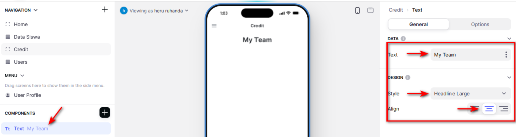 Ketiga, tambahkan komponen Text kemudian setinglah seperti gambar di bawah ini
