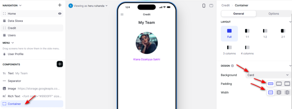Ketujuh, tambahkan komponen container dan setting seperti di bawah ini