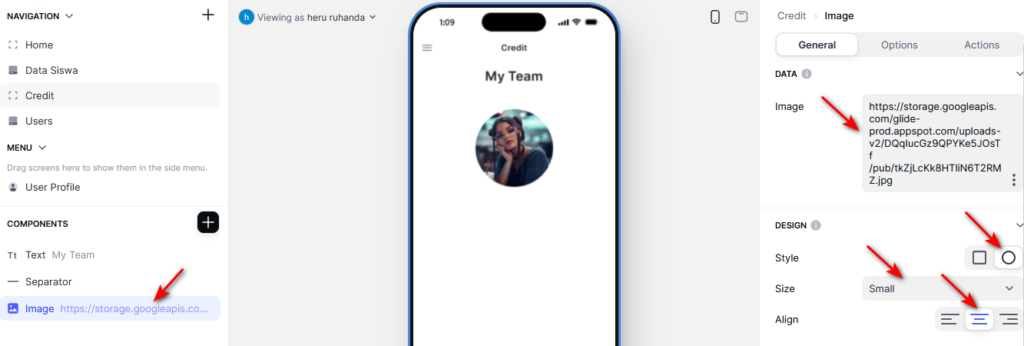 Kelima, tambahkan komponen Image dan setting seperti dibawah ini. Untuk image silahkan upload foto