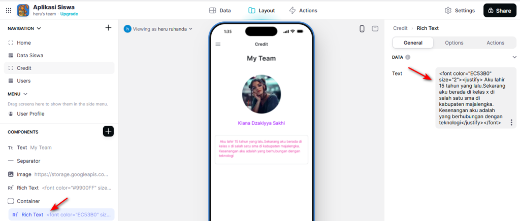 Keenam, tambahkan komponen Rich Text dan setting seperti di bawah ini. Untuk text silahkan bisa mengetikan script seperti ini