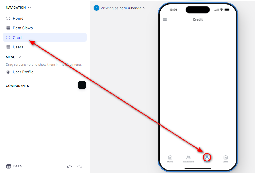 Pertama, pastikan project anda yang kemarin sudah dibuka. Kemudian buatlah navigasi baru dengan nama nama navigasi ‘Credit‘