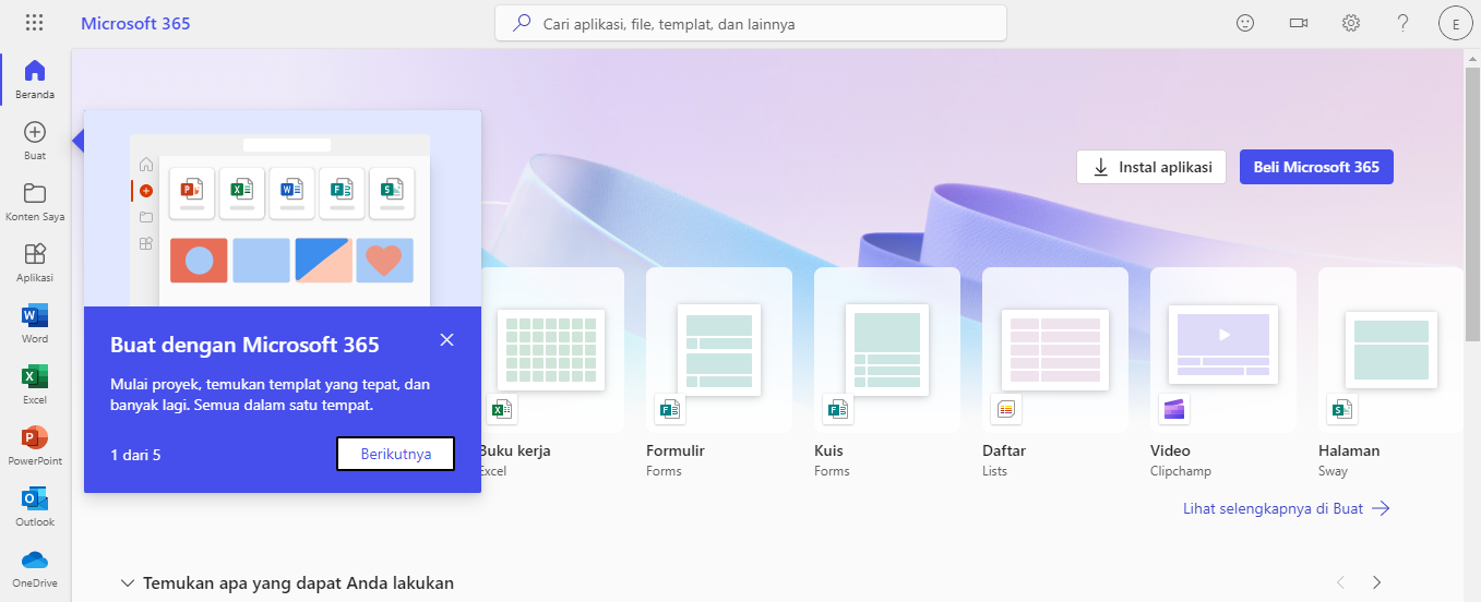 Microsoft Office 365 versi online, atau yang lebih dikenal sebagai Office Online, merupakan versi web dari aplikasi Microsoft Office yang populer. Ini memungkinkan pengguna untuk mengakses, membuat, dan mengedit dokumen menggunakan peramban web tanpa perlu menginstal aplikasi Office secara lokal. Untuk menggunakan office 365 versi online atau website kita harus membuat akun microsoft dulu setelah itu baru login ke dalam office.com untuk menggunakannya. Sekarang silahkan membuat akun microsoft terlebih dahulu pada situs microsoft.com