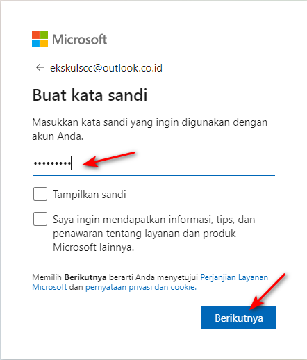 Selanjutnya buat sandi yang anda inginkan. Hilangkan ceklis pada kotak pilihan ‘saya ingin mendapatkan informasi’ karena admin tidak ingin menerima informasi tersebut. Lalu klik tombol Berikutnya
