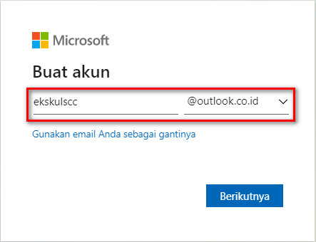 Silahkan isi dengan nama email yang anda inginkan dilanjutkan dengan mengklik tombol Berikutnya. Pada kasus ini admin membuat nama email seperti gambar di bawah ini.