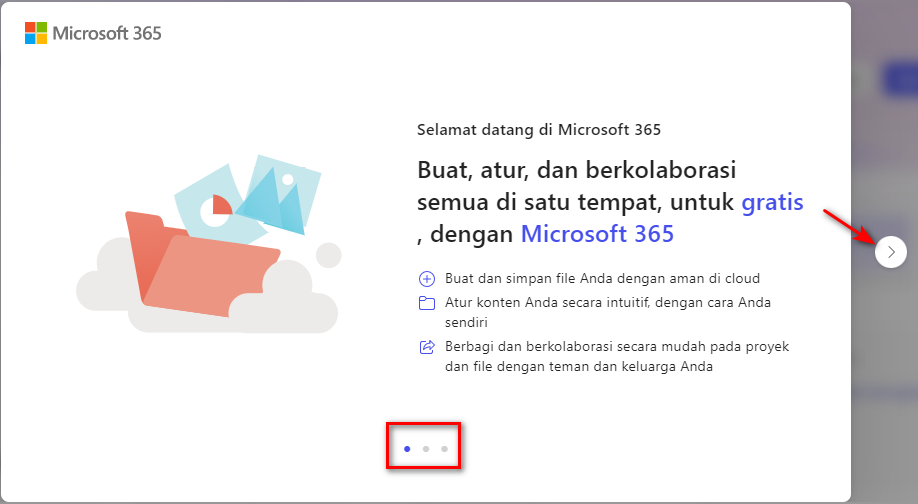 Silahkan isi email dan password microsoft yang baru saja dibuat pada situs tersebut. Jika sudah masuk pada tampilan awal silahkan klik tombol panah hingga tampilan pop up nya menghilang