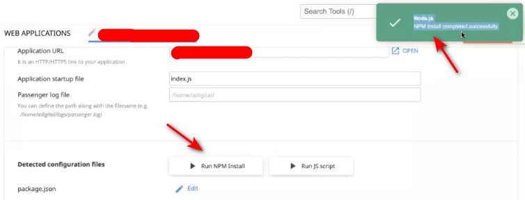 - Jika sudah di uplod silahkan refresh browser anda kemudian klik tombol Run NPM Install. Jika berhasil maka akan muncul notifikasi berhasil di sudut kanan atas.