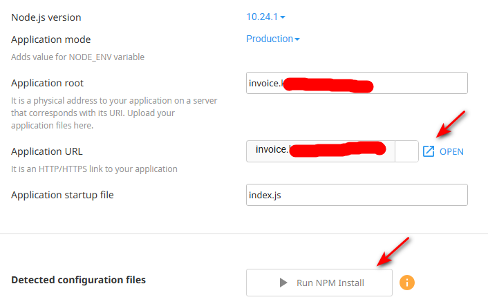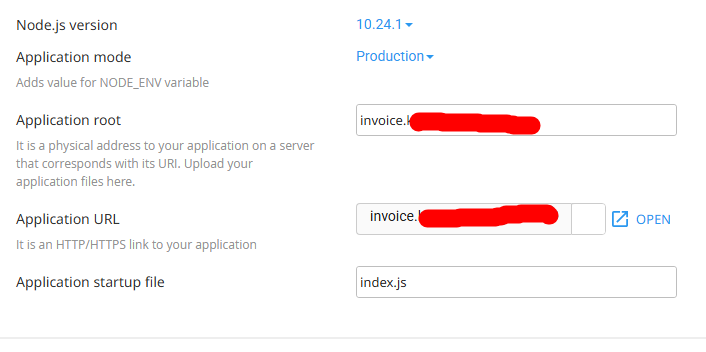 - Silahkan isi sesuai dengan projek anda. Pada kasus ini admin menggunakan versi node.js bawaan default cpanel. Aplication mode pilih Production. Application root admin samakan dengan nama subdomain yang admin buat pada langkah sebelumnya di atas. Application URL admin pilih nama subdomain yang admin buat pada langkah sebelumnya juga. Application starup file admin ketik index.js.