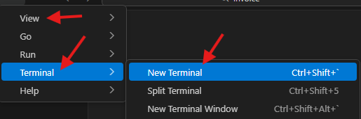 - Setelah folder aplikasi terbuka, aktifkan Terminal melalui View >> Terminal >> New Terminal.