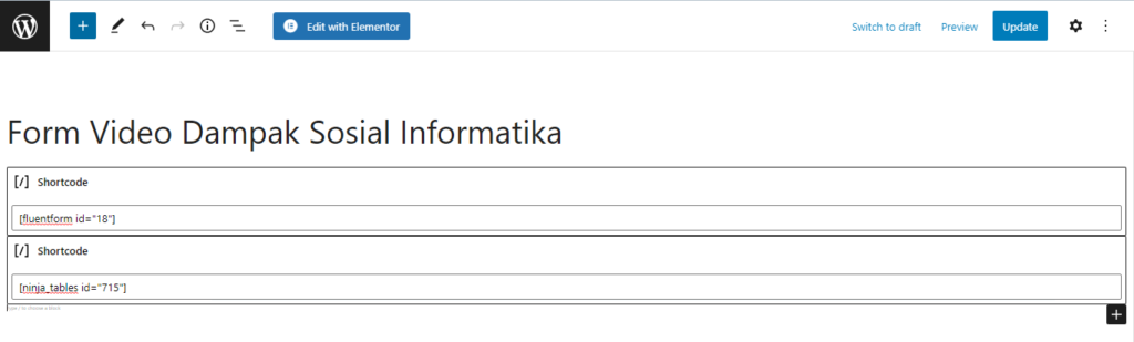 Keenam, masuk ke dalam postingan form yang telah kita buat. Kemudian sisipkan dua short code. Short code pertama adalah form inputan dari fluent form dan short code adalah view hasil inputan form tersebut dari ninja tables. Kemudian klik update