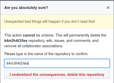 8. Klik I understand the consequences, delete this reposistory
